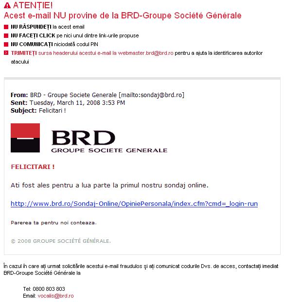 Atacul de tip phishing lansat vineri, care s-a folosit de numele BRD, a fost stopat. Site-ul care continea aceasta tentativa de frauda prin e-mail a fost inchis la doar cateva ore de la aflarea asupra atacului.