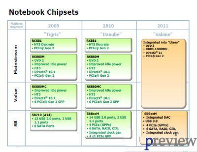Anul 2011 va adduce o adevarata premiera si anume platforma “Sabine”. Aceasta va avea “Llano APU” ( Unitate de Procesare Accelerata), suport pentru memorii DDR3 la 1600MHz, Direct X11 si UVD 3.